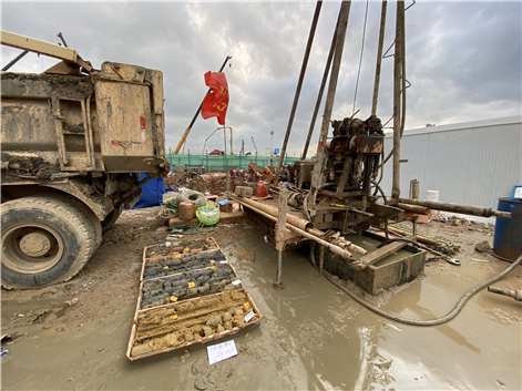 3月6日,臨時(shí)棧橋正式通車(chē),勘察團(tuán)隊(duì)與眾多施工隊(duì)伍一同入場(chǎng),并在當(dāng)天晚上就提供了現(xiàn)場(chǎng)施工緊急需要的地質(zhì)柱狀圖及剖面圖。由于現(xiàn)場(chǎng)參建單位眾多,作業(yè)面有限,工人們只能開(kāi)展交叉作業(yè),在泥土松軟的場(chǎng)地上不斷搬動(dòng)鉆機(jī),調(diào)整作業(yè)地點(diǎn)。