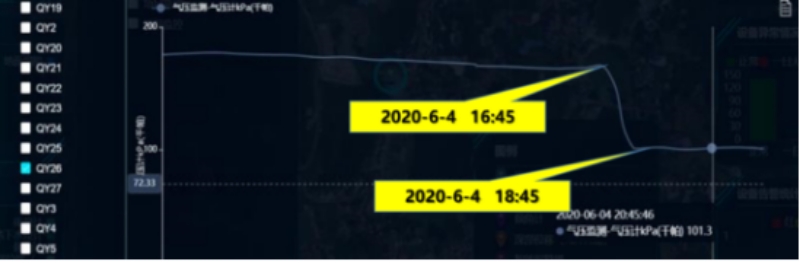 2、從6月4日17:45-18:45,氣壓監(jiān)測(cè)孔QY26氣壓突降65kp,形成負(fù)壓。