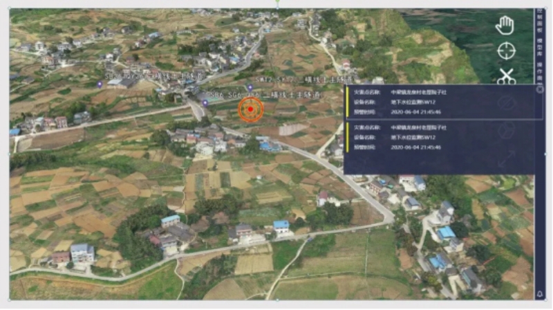 2020年6月4日晚18點(diǎn)45分,歌樂山一級(jí)監(jiān)測(cè)項(xiàng)目12號(hào)監(jiān)測(cè)點(diǎn)(位于龍泉村村委會(huì)附近)的水位、水壓、氣壓三個(gè)監(jiān)測(cè)傳感器均超過設(shè)定的預(yù)警閾值,系統(tǒng)實(shí)時(shí)捕捉到異常情況并立即觸發(fā)平臺(tái)告警: